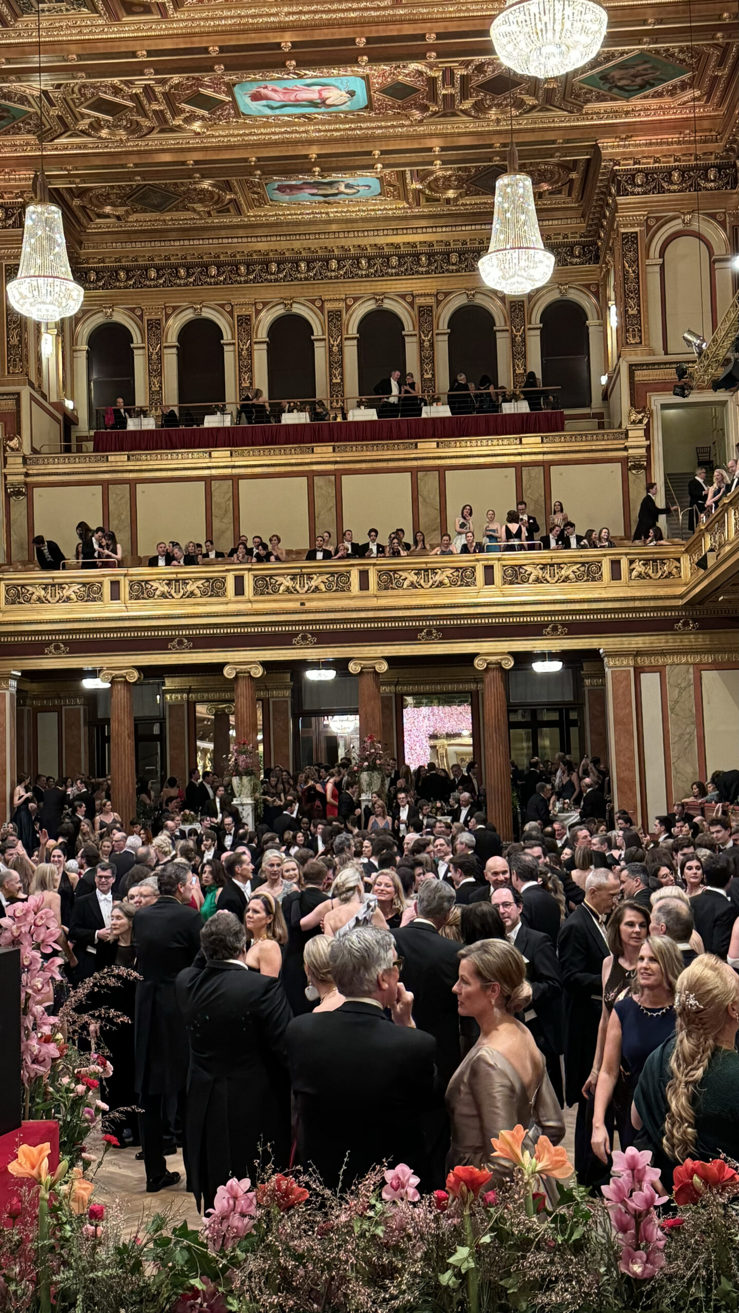 Ακόμα θυμάμαι τον πρώτο μου χορό στη Musikverein. Τη στιγμή που αντίκρυσα τη μεγάλη αίθουσα, ένιωσα σαν να είχα μπει σε μια σκηνή από παραμύθι. Οι πολυέλαιοι έλαμπαν φωτίζοντας την αίθουσα που ήταν διακοσμημένη με ροζ λουλούδια σε κάθε γωνιά. Όλοι οι μουσικοί της ορχήστρας, καθισμένοι στις θέσεις τους, ήταν έτοιμοι να ξεκινήσουν. Οι κύριοι με τα φράκα τους και οι κυρίες με τα εντυπωσιακά βραδινά φορέματά τους συμπλήρωναν την ατμόσφαιρα μεγαλείου. Φόρεσα κι εγώ ένα λαμπερό μπλε φόρεμα και ανυπομονούσα να ζήσω αυτή τη μαγική εμπειρία. Η ορχήστρα άρχισε να παίζει την 9η συμφωνία του Beethoven και όλοι με μια φωνή στην αίθουσα ξεκίνησαν να τραγουδούν τους στίχους από το ποίημα του Friedrich Schiller, «Ode an die Freude», «Ωδή στη χαρά».