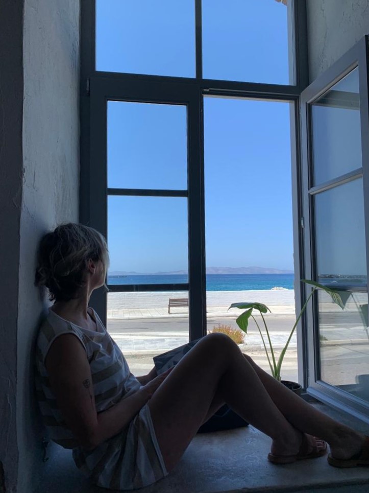 Όταν επισκέπτομαι την Τήνο, αν είμαι τυχερή, το πρώτο πράγμα που θα δω όταν ξυπνάω είναι τη γραμμή ενός απέραντου ορίζοντα. Έπειτα, ορίζω την πολυτιμότατη απόλαυση της ζωής, την τελετουργία του καφέ δηλαδή, αυστηρά με το combo “μεγάλα παράθυρα του Κουρσάρου – θέα των πλοίων που πηγαινοέρχονται – βιβλίο”.