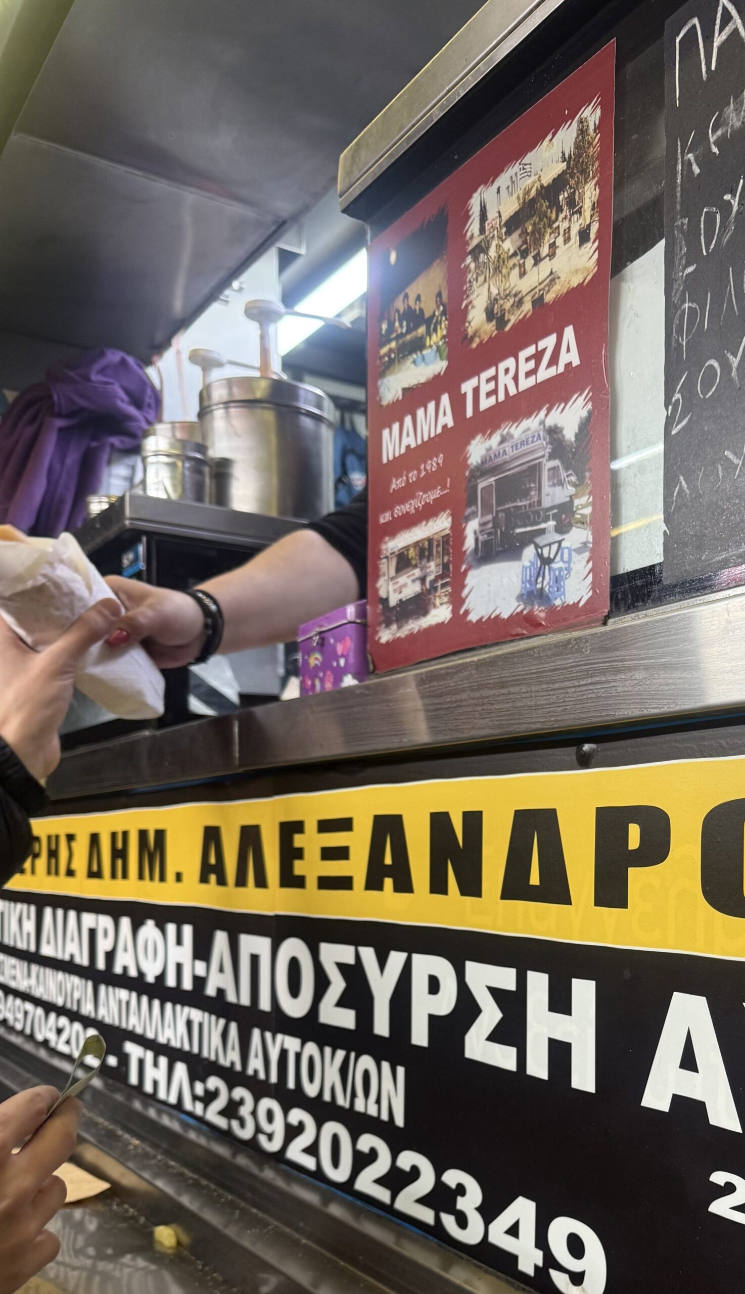 Και όταν η νύχτα φτάνει στο τέλος της (ή η μέρα ξεπροβάλλει, όπως το δει κανείς), υπάρχει σχεδόν πάντα μια τελευταία στάση. Μετά τη νυχτερινή διασκέδαση, όταν όλοι έχουν κουραστεί αλλά κανείς δεν θέλει ακόμη να πάει σπίτι, η μαμά Τερέζα είναι η λύση. Εγώ δεν βάζω κρεμμύδι, αν και με κράζουν, αλλά απολαμβάνω εξίσου τη «βρομιά».