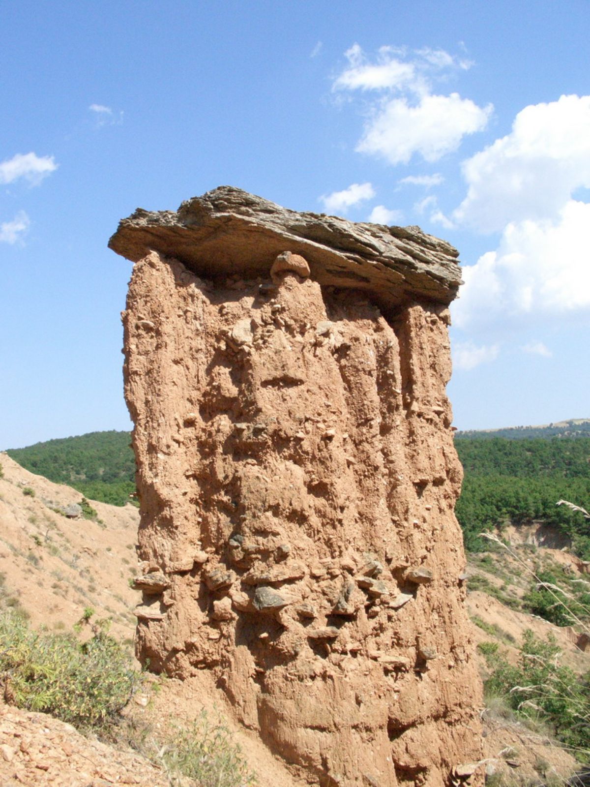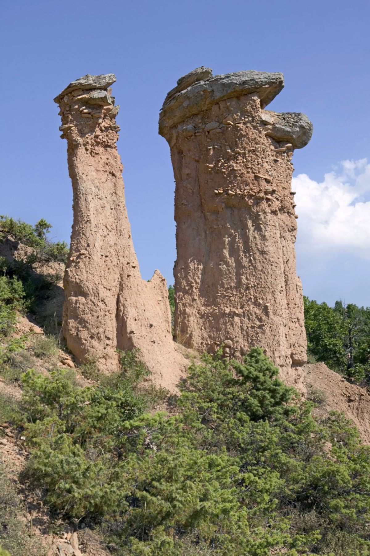 Με ύψος που μπορεί να φτάσει μέχρι τα 7 μέτρα, οι απόκοσμοι αυτοί σχηματισμοί αποτελούνται από άμμο, κροκάλες, μάργες, άργιλο και συγκολλητική ύλη από οξείδια του σιδήρου και διοξείδιο του πυριτίου, ενώ η κορυφή τους καλύπτεται από έναν σχιστόλιθο βράχο, ο οποίος είχε το ρόλο της ομπρέλας θυμίζοντας σε μεγάλο βαθμό θεόρατα «πέτρινα μανιτάρια» ή, όπως σημαίνει και στο τοπικό ιδίωμα, καμινάδες.