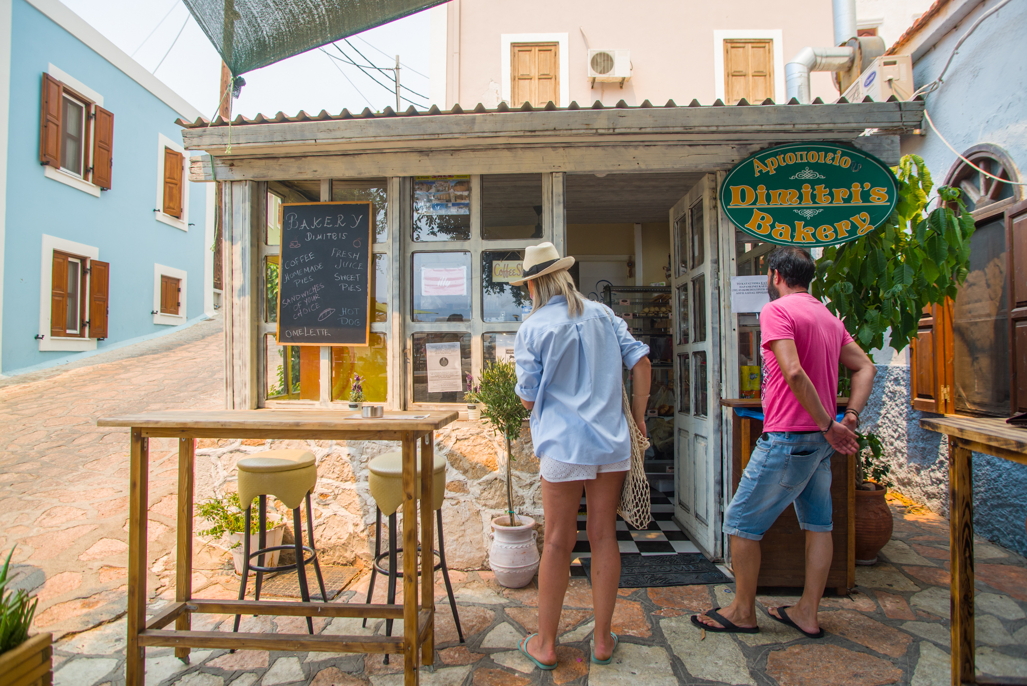 Στο Εμπορειό βρίσκονται μαζεμένη ολόκληρη η Χάλκη. Εκεί θα βρείτε όλα τα διαθέσιμα καταλύματα του νησιού, όλα τα εστιατόρια και όλα τα λιγοστά, μικρά μπαράκια που ζωντανεύουν τις νύχτες, ανάβοντας τα φωτάκια τους πλάι στη θάλασσα. Και, βέβαια, τον φούρνο του Δημήτρη, σε κεντρικό σημείο του χωριού για να αγοράσετε φρέσκο ψωμί και πολύ νόστιμες πίτες. Φτιάχνει και καφέ, χυμός, αλλά και σάντουιτς και γρήγορα σνακ αν θέλετε να πάρετε κάτι γρήγορο στο χέρι.