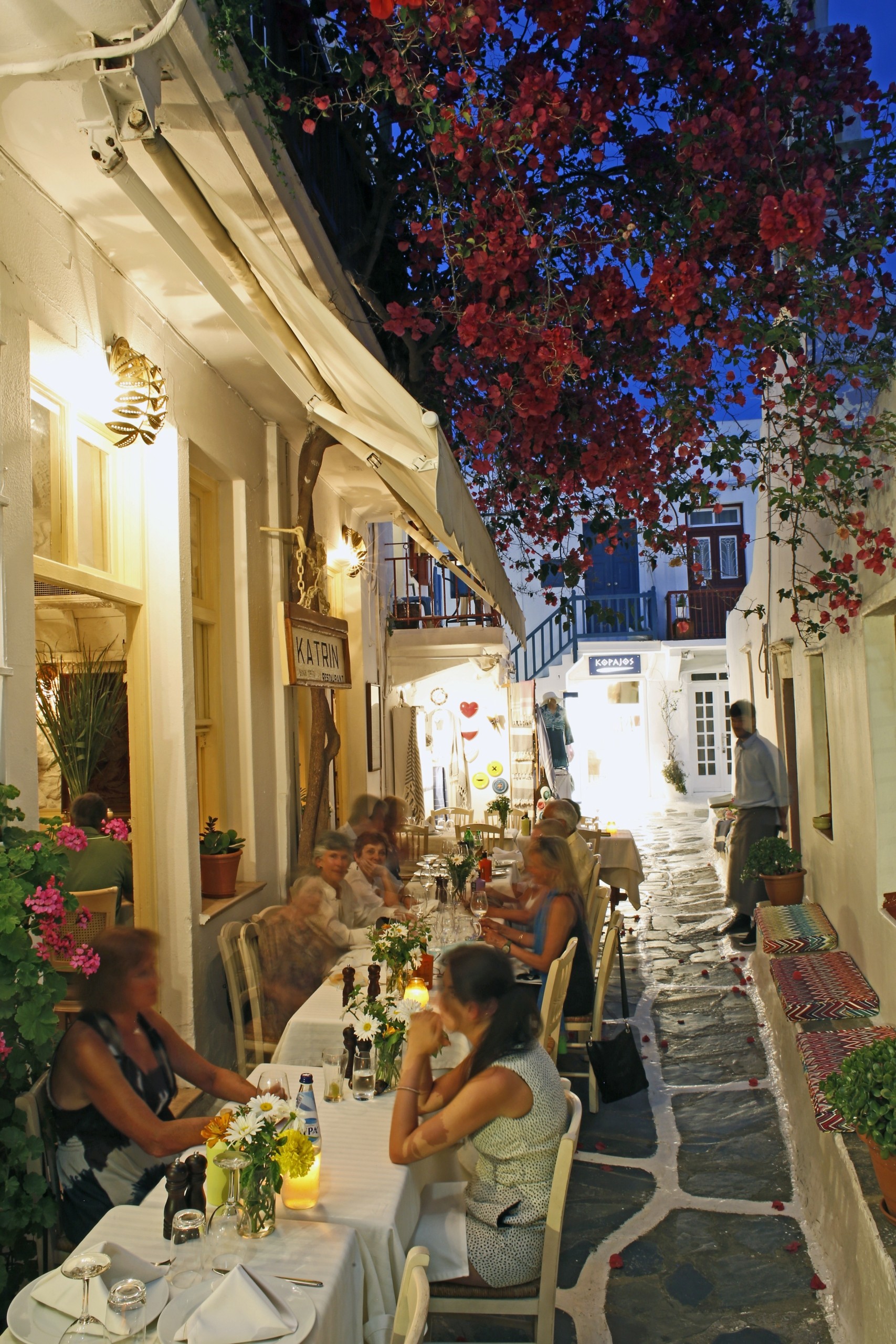 Έχοντας την τύχη να γνωρίζω τις σωτήριες παρακάμψεις, βαδίζω αργά και απολαυστικά σε πιο ήσυχα και λιγότερο θορυβώδη σημεία. Κάνω μια στάση στο θρυλικό Katrin, δίπλα στον Άγιο Γεράσιμο, κάτω από μια επιβλητική μπουκαμβίλια. Ένα από τα ιστορικά εστιατόρια της Μυκόνου, φροντίζει από τις αρχές της δεκαετίας του 1970 τους εκλεκτούς πελάτες του με την απαράλλαχτη εκπληκτική ποιότητά του, με συνταγές της μητέρας του ιδιοκτήτη, Κατερίνας, απ’ όπου πήρε και το όνομά του. Ο Περικλής, ο Βαγγέλης, η Θεοδώρα, η Τασία και οι οικογένειές τους, μεγαλώνοντας στην αγκαλιά αυτής της επιχείρησης, έχουν και τη δική τους αγκαλιά ανοιχτή στους φίλους τους, κάποιοι από τους οποίους μετράνε ήδη δεκαετίες σε αυτή την ιδιότυπη σχέση.