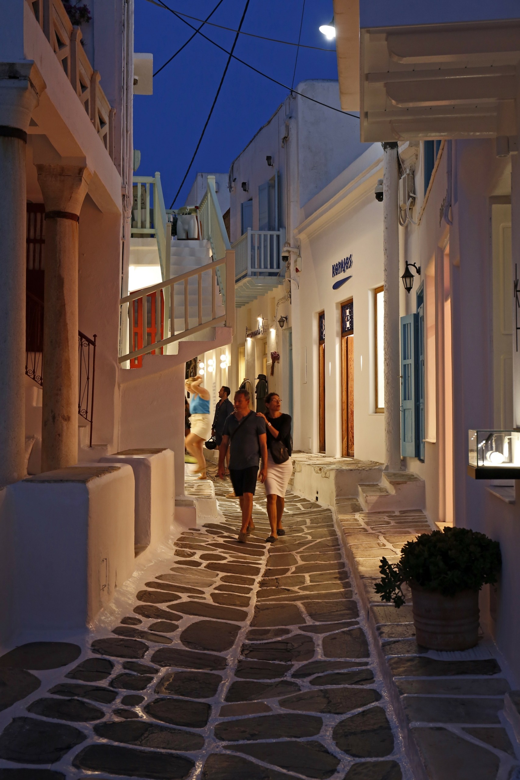 Η βόλτα στη Χώρα, όταν δεν είναι ανυπόφορα φορτωμένη από «όλον τον πλανήτη», είναι σαν ένας φόρος τιμής στη διαφορετικότητα αυτού του νησιού και όλες οι προσπάθειες σύγκρισης της Μυκόνου με άλλα νησιά, παρόμοια, κυκλαδίτικα, λευκά, με παραλίες, παράδοση και λοιπά και λοιπά δε θα σταματήσει να πέφτει στο κενό. Προσπαθώντας να μην πέφτω επάνω στους αμέτρητους selfies-τουρίστες, που δε βλέπουν που πατούν, χαμογελώ με τον ενθουσιασμό τους και με την έκφραση ευγνωμοσύνης, με την οποία ποζάρουν για τα κοινωνικά δίκτυα του παγκοσμιοποιημένου ψηφιακού περιβάλλοντος. Σαν ένα διαχρονικό φωτογραφικό στούντιο, τα στενά της Χώρας προσφέρουν όλες τις διαφορετικές, φωτιστικές συνθήκες, να φωτίσουν τα πρόσωπα και τις επιθυμίες, μέρα και νύχτα.